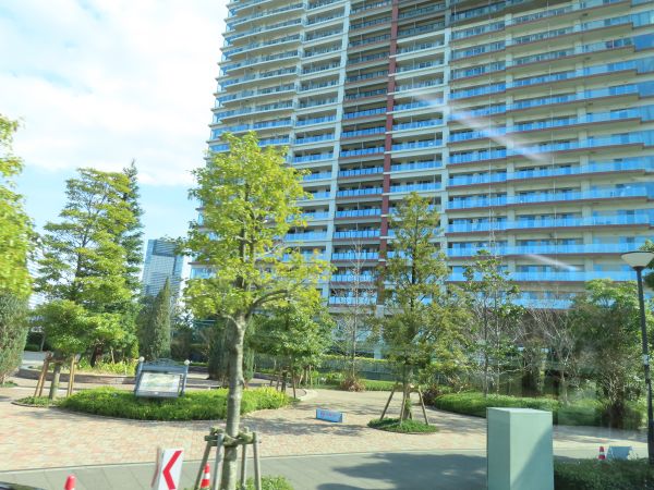 次は晴海二丁目に停車する。こちらも、タワーマンション「ザ・パークハウス晴海タワーズ」の前に停留所がある。ここでは多くの乗客が乗ってきて、立つ客もいる。