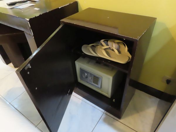 デスク横の棚には、セイフティボックスとスリッパが置かれている。
