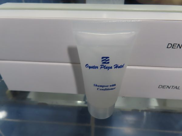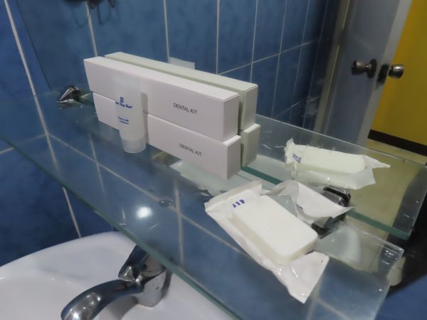 アメニティとして、歯ブラシ、固形石鹸、シャンプーが置かれていた。固形石鹸は写真を撮る前に開けてしまったが、袋にはホテルの名前が入っていた。