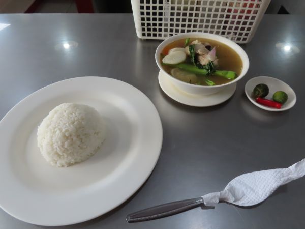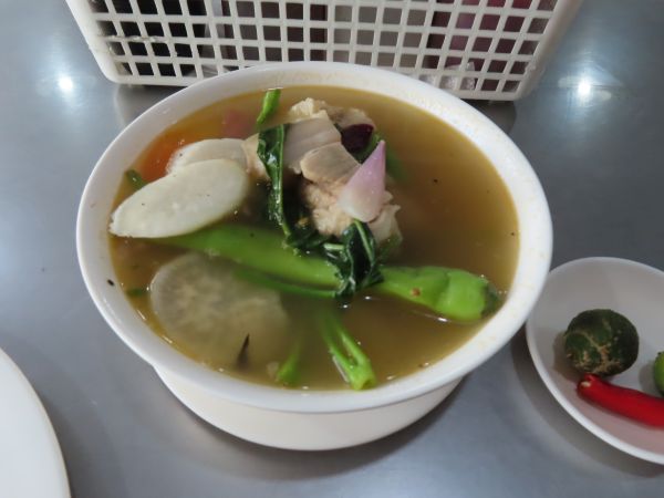 Pork Sinigang。「シニガン(Sinigang)」もフィリピン料理で、やや酸味のあるスープである。豚肉の塊が入っており、美味しくいただいた。130ペソ也。