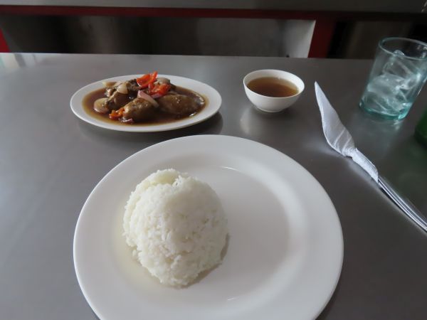 Chicken Adobo。「アドボ(Adobo)」とはフィリピンの煮込み料理であり、これは鶏肉の煮込みであった。日本人の口にも合う味付けだと思う。これにご飯がついて125ペソ也。