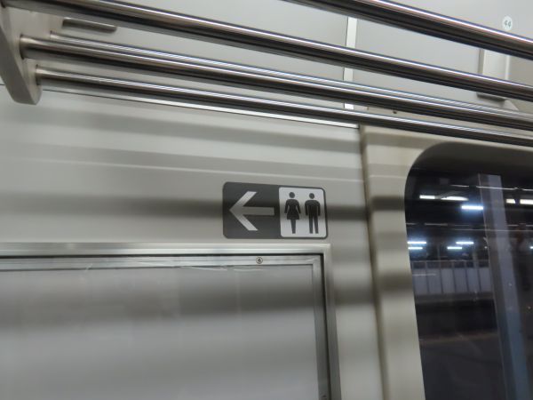 トイレの位置を表示するシールが車内に貼られている。