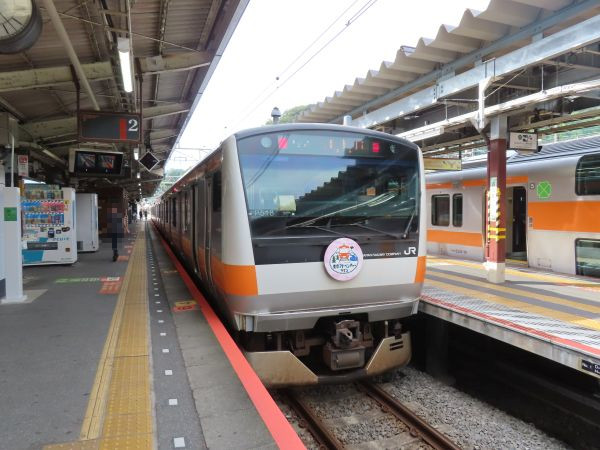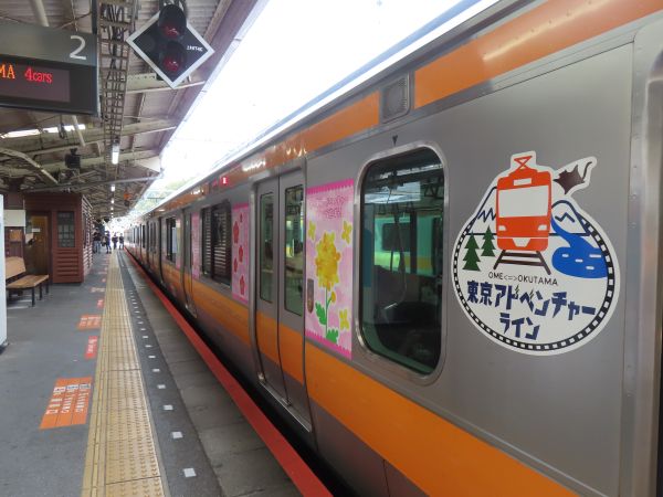 中央線快速列車を走る車両と同じであるが、前面には同区間の愛称である「東京アドベンチャーライン」のヘッドマークが掲出され、車両にはラッピングがなされ、僅かではあるが特別感がある。