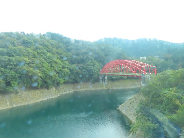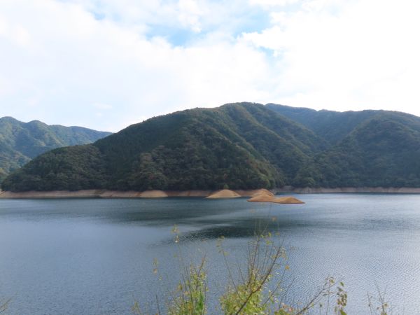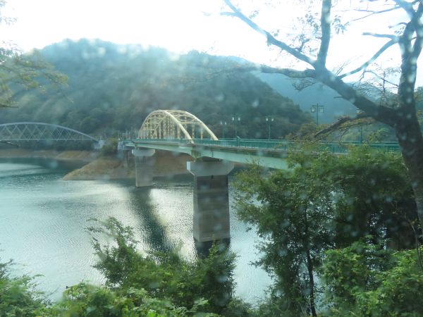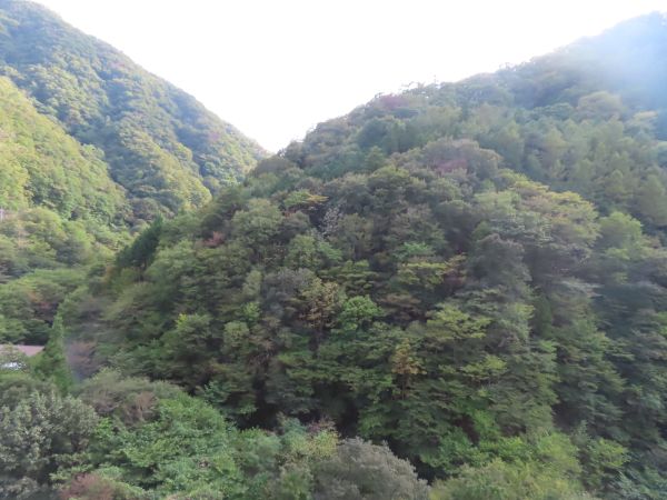 奥多摩湖の停留所を出ると、再び国道411号に戻り、奥多摩湖に沿って進む。この辺りの国道411号は片側1車線で、湖と崖に挟まれた狭いところに道がある。カーブも多く、バスの速度は自ずとゆっくりになる。後ろに車の列ができるので、時折、道幅が広くなったところで後続車に道を譲る。停留所の間隔はこの辺りも比較的短いものの、乗降はない。車道の脇に歩道はないが、そもそも歩いている人を見かけない。