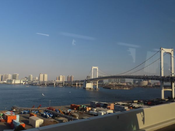 レインボーブリッジは上下二層構造になっており、上に首都高速11号台場線、下にゆりかもめと一般道が通っている。