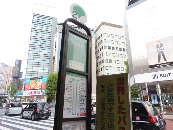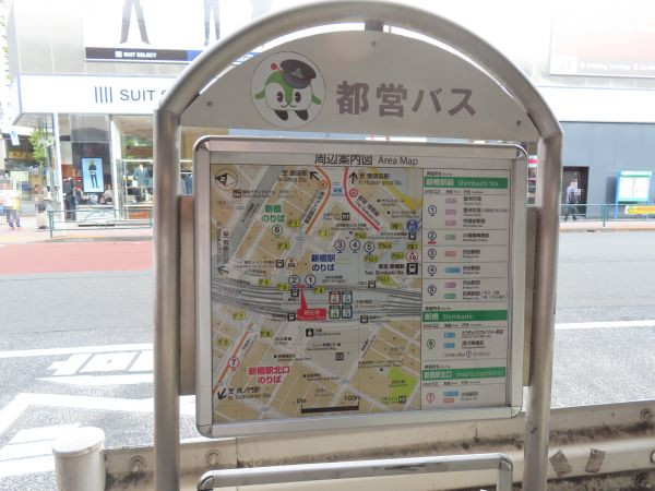 橋63系統は、新橋駅では、JR新橋駅銀座口を出たところにある2番乗り場から出発する。停留所のポールは、京成バスの稲毛駅行き深夜バスの停留所と並んでいる。