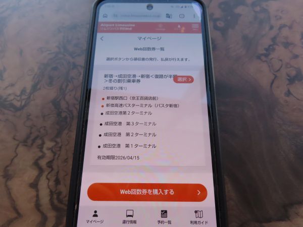 新宿から成田空港までの運賃は、通常片道3,600円であるが、この冬は「リムジンバス冬の割引キャンペーン【復路が半額!】」というキャンペーンを実施しており、2025年12月16日から2026年2月28日まで、往復5,400円のキャンペーン乗車券を発売していた(乗車可能期間は2026年4月15日までである)。乗車に当たっては、事前に、リムジンバス予約WEBの「Web回数券一覧」から上記の割引乗車券を購入の上、バスを予約する際に、決済方法を選択するところで「WEB回数券」を選択して適用させる。