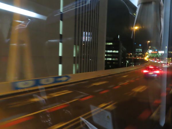 以前に逆方向で乗車した時は、小菅JCTから中野長者橋まで首都高速中央環状線を走行したが、今回は、新宿出入口から首都高速4号新宿線に入り、三宅坂JCTで都心環状線、江戸橋JCTで6号向島線へ移る。交通量は多く、速度はゆっくりであり、箱崎付近を20時25分に通過する。